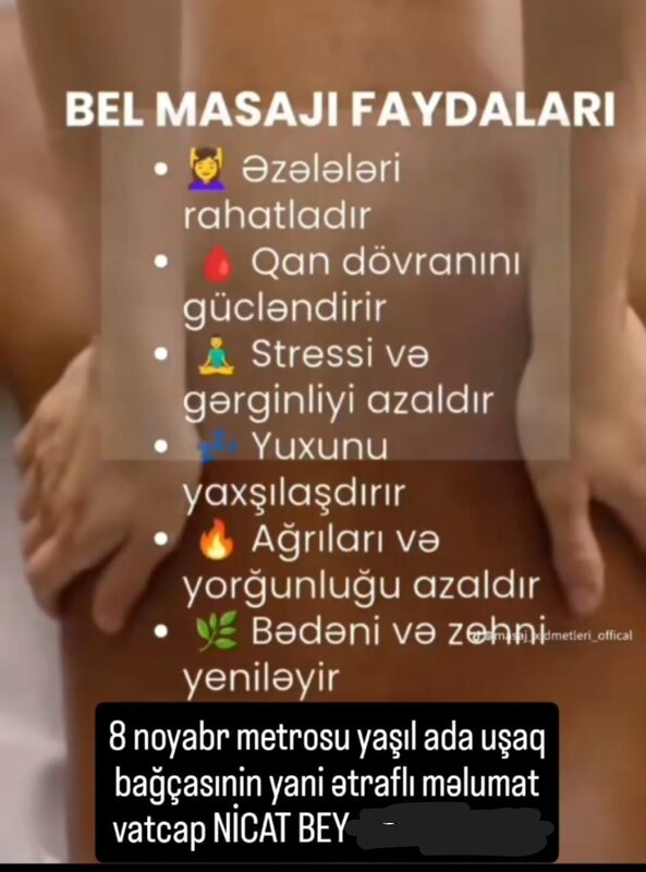 100 Azn Salam tibbi masaj xidmet gosterirem.8il stajim var.kurs kecmsem.diplom sertifikatim var.sport klassik relaxs.sizlere hansi masaj uygundursa hemen masaji edirem.1saat masaj 50m .1saat erzinde butun beden masaj olur.intim