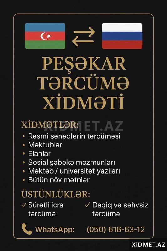 3 Azn Peşəkar tərcümə xidməti sizin tərcümə ehtiyaclarınızı qarşılayır. Tərcümə xidməti yüksək keyfiyyətli tərcümələr təqdim edir və müxtəlif növ mətnlərin tərcüməsini həyata keçirir: elmi məqalələr, məktublar, şirkət