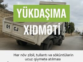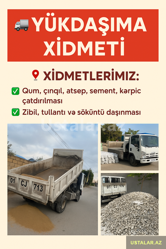 Bütün növ zibil (tullantı) və söküntü daşınması, zibil maşını sifarişi, yük daşıma xidməti, qum, atsep, çınqıl və karbonat (atval, daş qırıntısı) daş tozu satışı və çatdırılması xidmətlərini vaxtında və etibarlı şəkildə, ekoloji təhlükəsizlik ön planda tutaraq, sərfəli qiymətlərlə və müxtəlif ölçüdə həllər təklif edirik. Bina və mənzildən çıxan bütün növ tullantı zibil və söküntülərin çıxarılıb atılması!